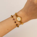Make a heartfelt statement with our Vintage Alba Oval Valentine's Gold Watch, a romantic vintage find defined by its elegant oval silhouette and whimsical heart motif bracelet. Finished with red garnet accents, this timepiece blends sweet Valentine inspired details with classic vintage appeal.