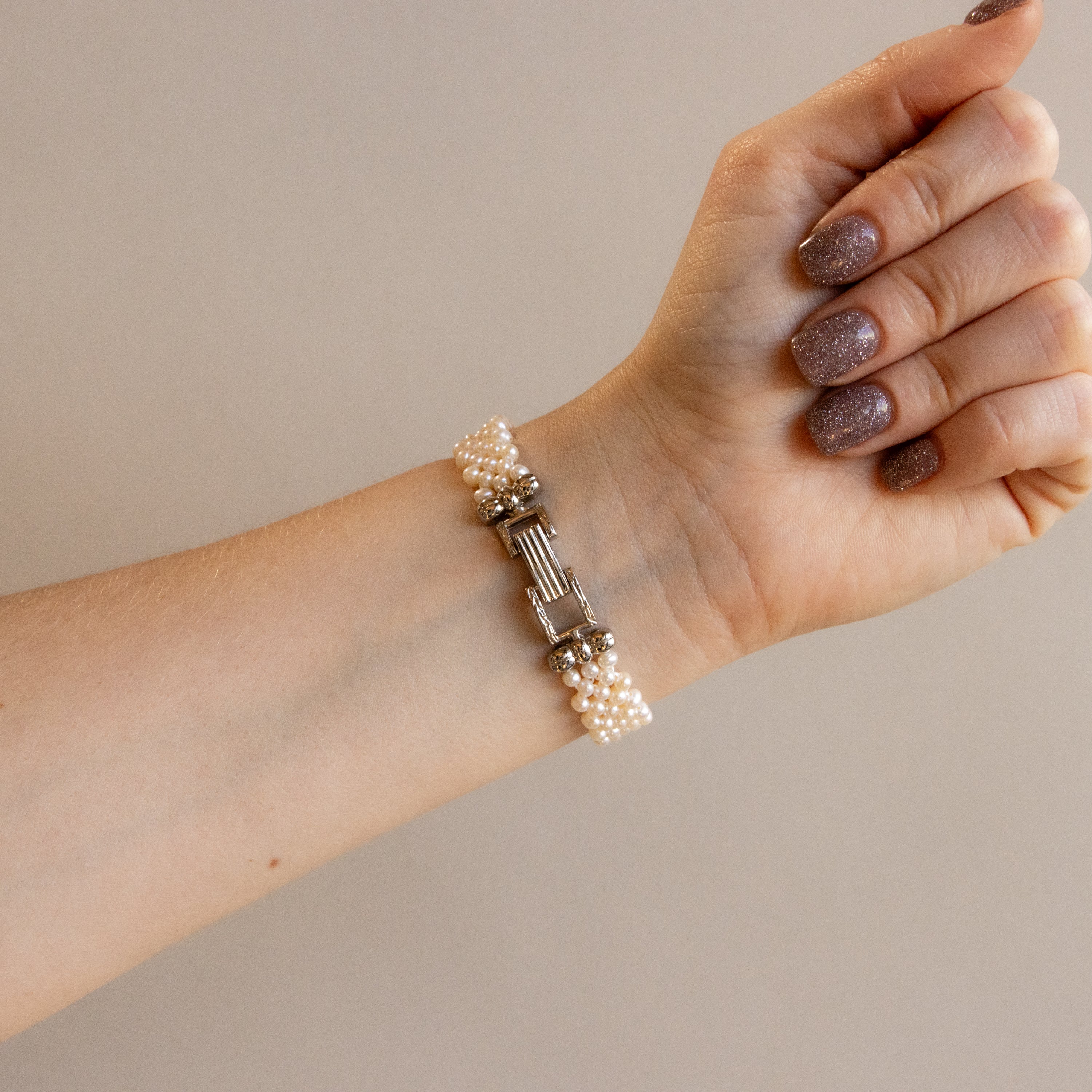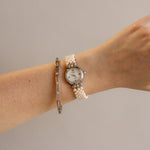 Softly radiant and refined, this Vintage Sum Kam Round Pearl Silver Watch features a shimmering mother of pearl dial paired with a classic round silver silhouette. With its pearl bracelet, this piece adds a touch of romantic elegance to every look.