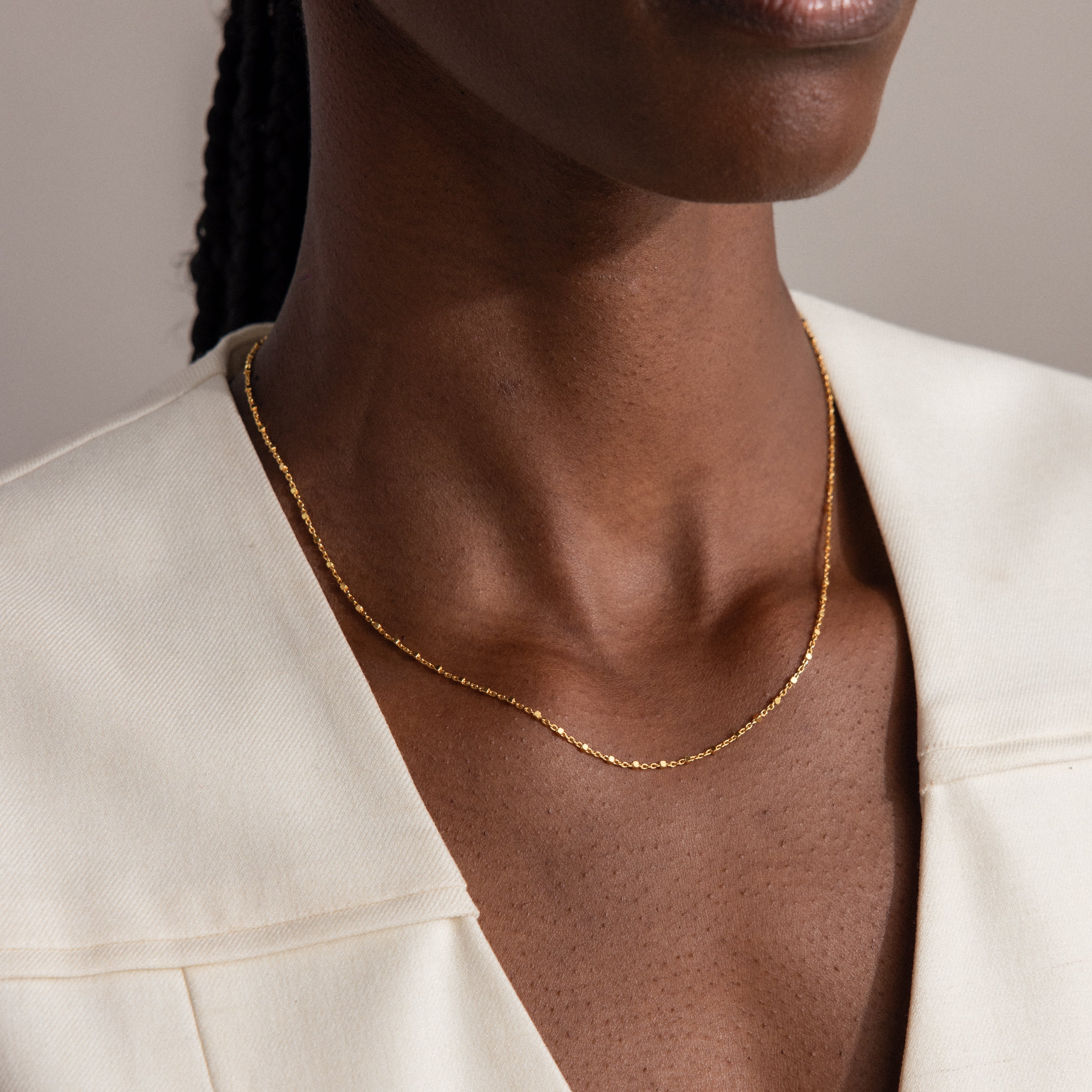 Designed for the minimalist with an eye for detail, our Dot Station Necklace offers a unique take on the classic chain, sparkling subtly with every movement. Its delicate dotted design layers effortlessly with other pieces or stands alone with quiet sophistication.