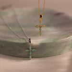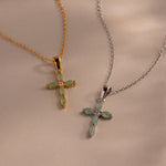 A beautiful blend of symbolism and style, our Marquise Jade Cross Necklace features delicate jade stones radiating from a sparkling central crystal. The serene green hue and graceful design evoke a sense of harmony and balance, making this a truly timeless piece