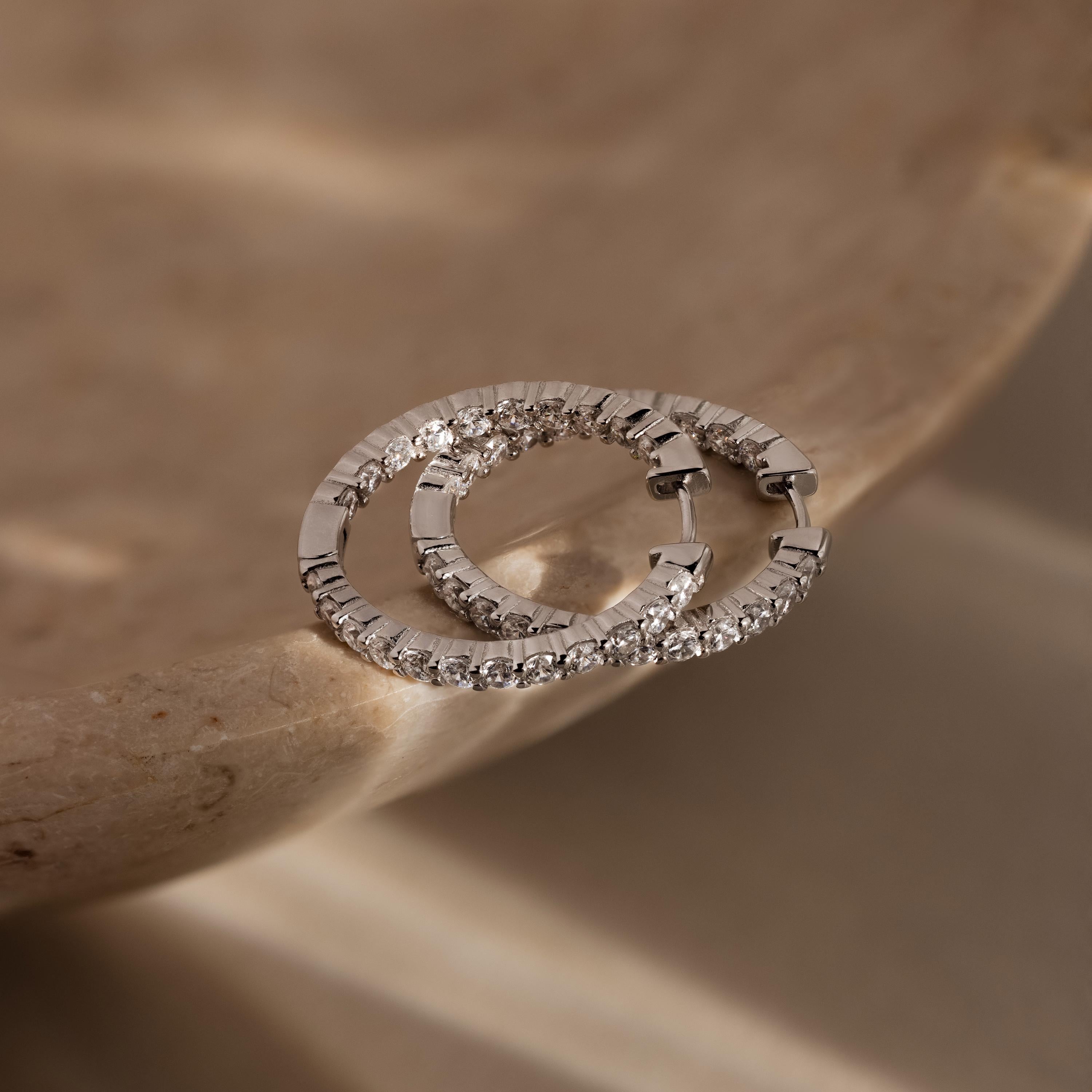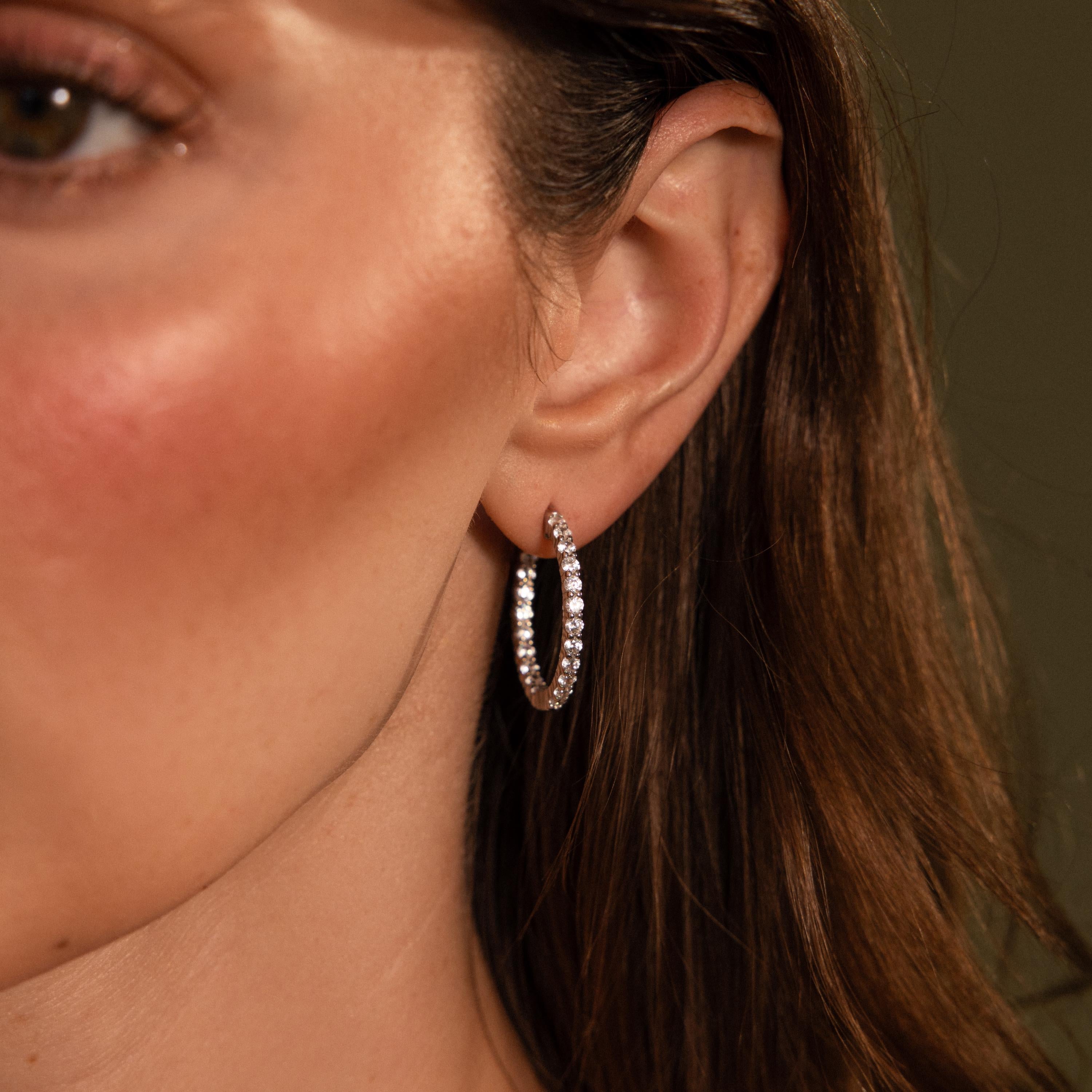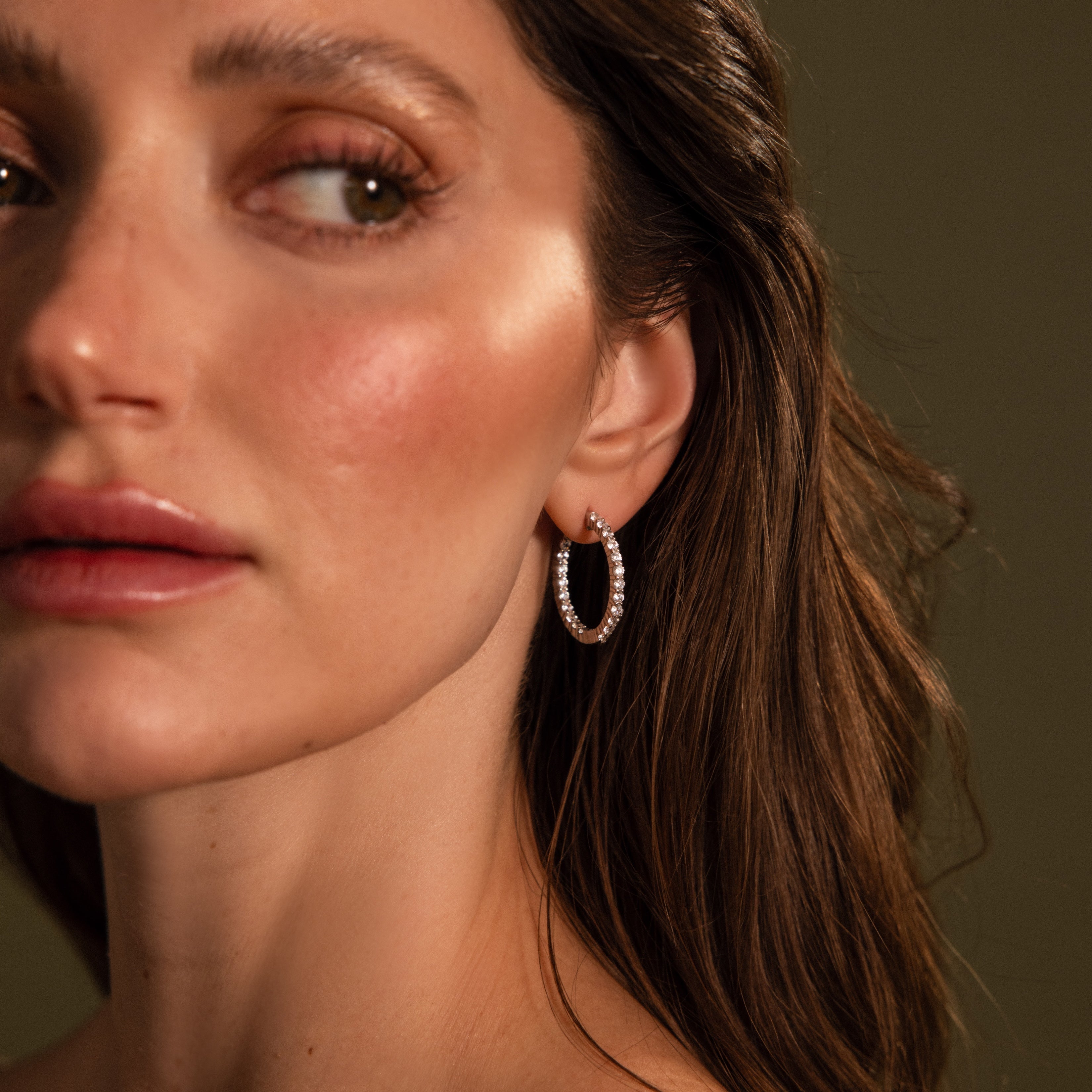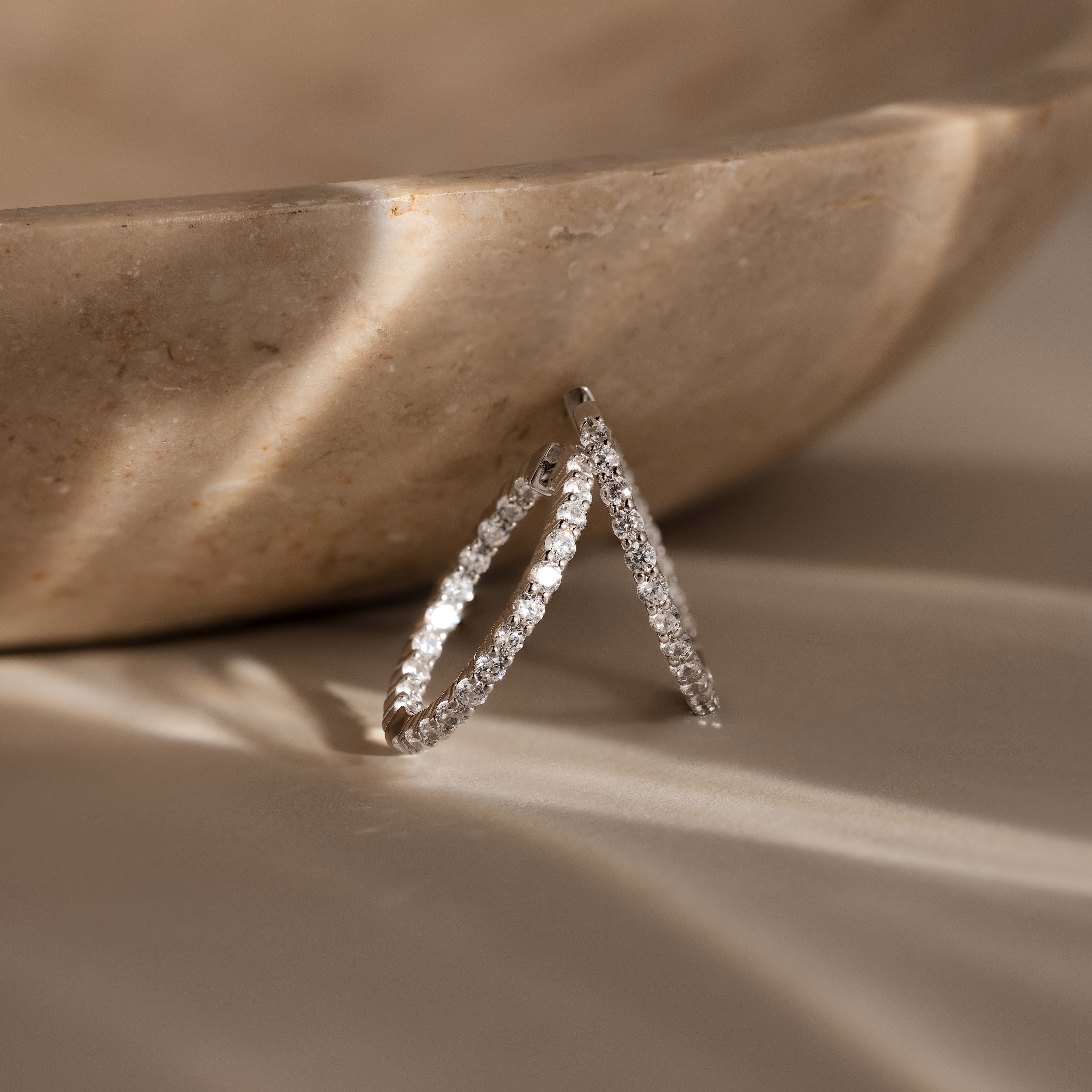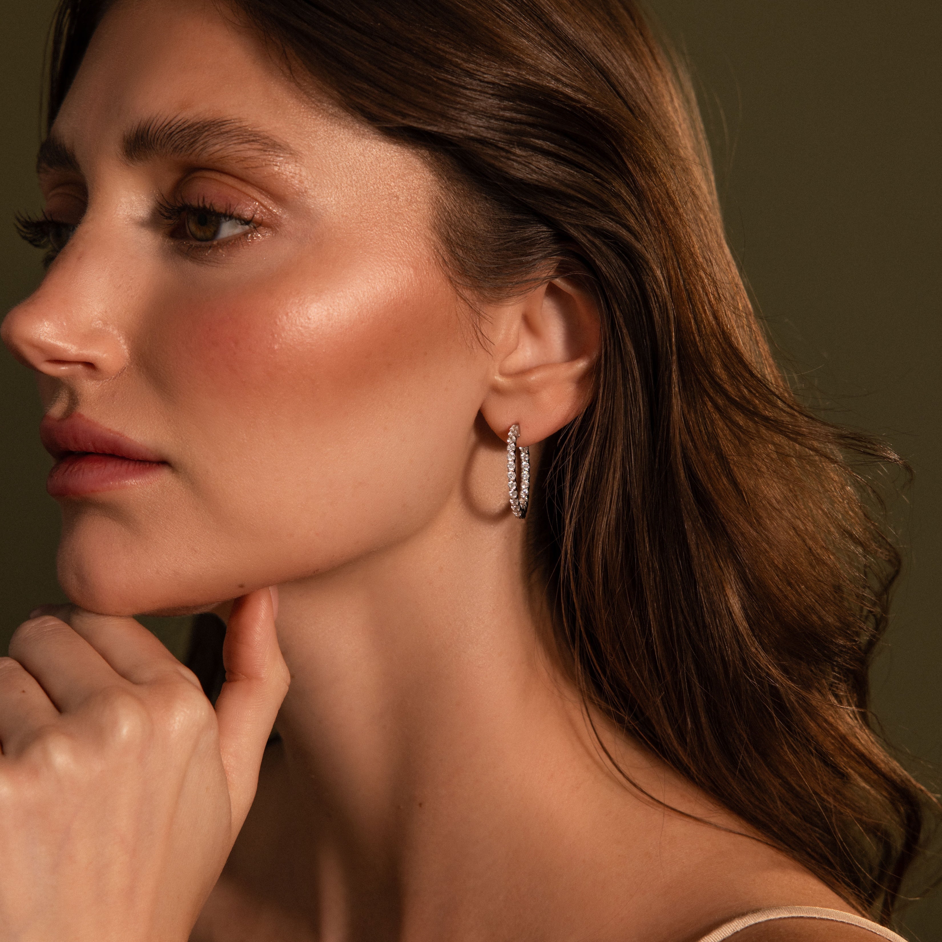 Introducing our Inside Out Diamond Hoops, a refined take on our classic huggie design. With stones set along both the front and inner edge, these hoops deliver continuous sparkle from every angle. Available in 18k gold and silver, each finish offers its own timeless appeal while maintaining the same luminous elegance. Effortlessly versatile, they're a polished staple for everyday wear or elevated evenings.