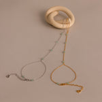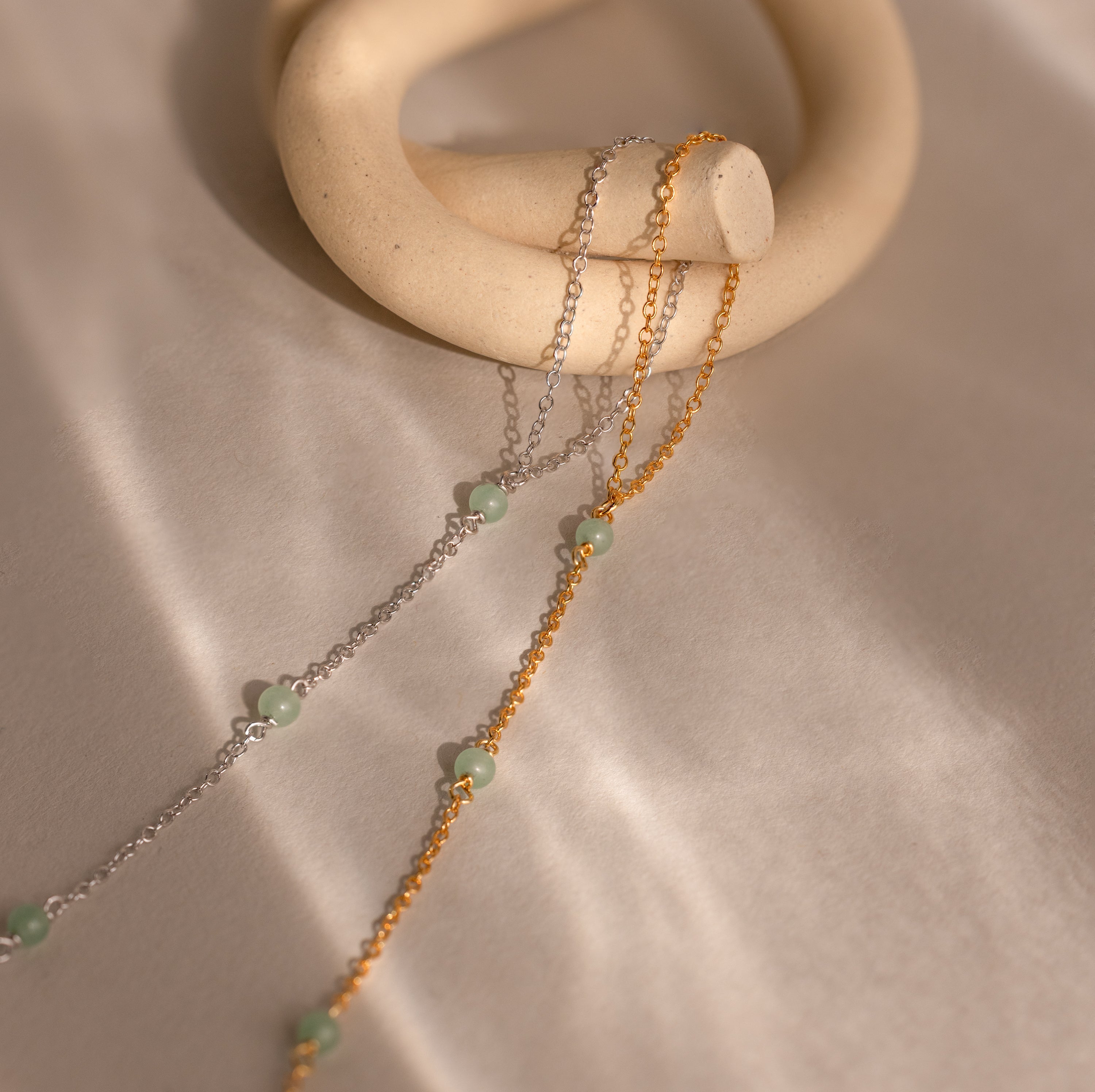 A delicate balance of elegance and edge, our Jade Hand Chain Bracelet drapes gracefully from wrist to finger in a fine gold silhouette. Soft green jade beads are thoughtfully placed along the chain, adding a subtle touch of color and natural beauty. Designed to move effortlessly with you, this hand chain brings a refined, ethereal feel to everyday moments and special occasions alike.